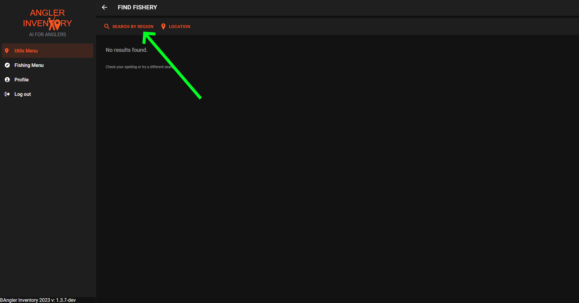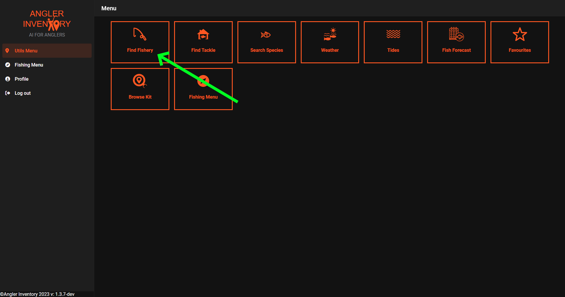 In order to search for fisheries within a certain region in the UK, first start from the Utils Menu on the main page of the Angler Inventory application, shown below.